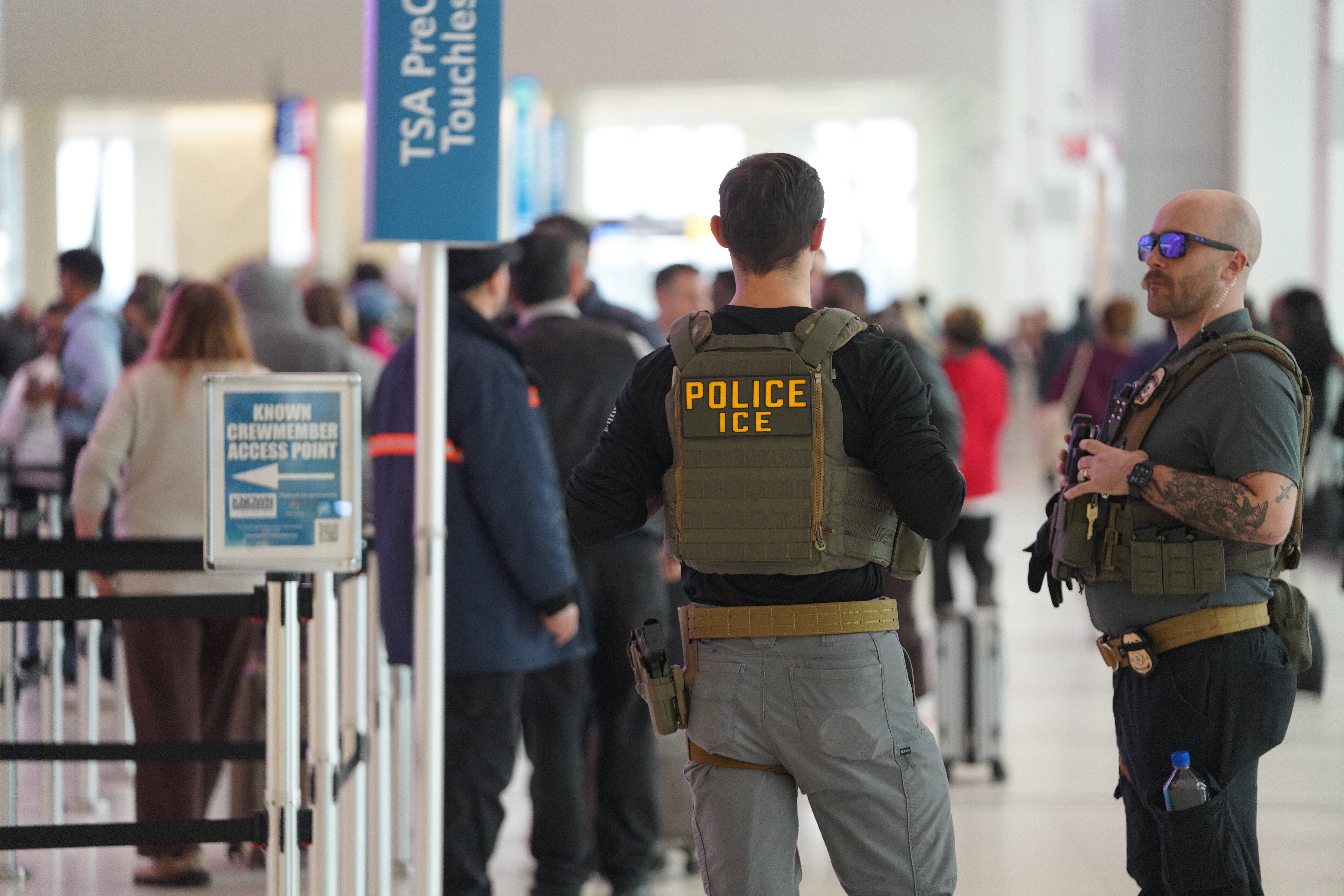 3月23日,移民与海关执法局的执法人员在美国纽约拉瓜迪亚机场的出发安检处执勤。新华社记者张凤国摄为缓解因安检人员停薪而缺勤所导致的机场混乱局面,特朗普3月27日下令为美国运输安全管理局雇员发放薪酬。这批薪酬于本周发放。